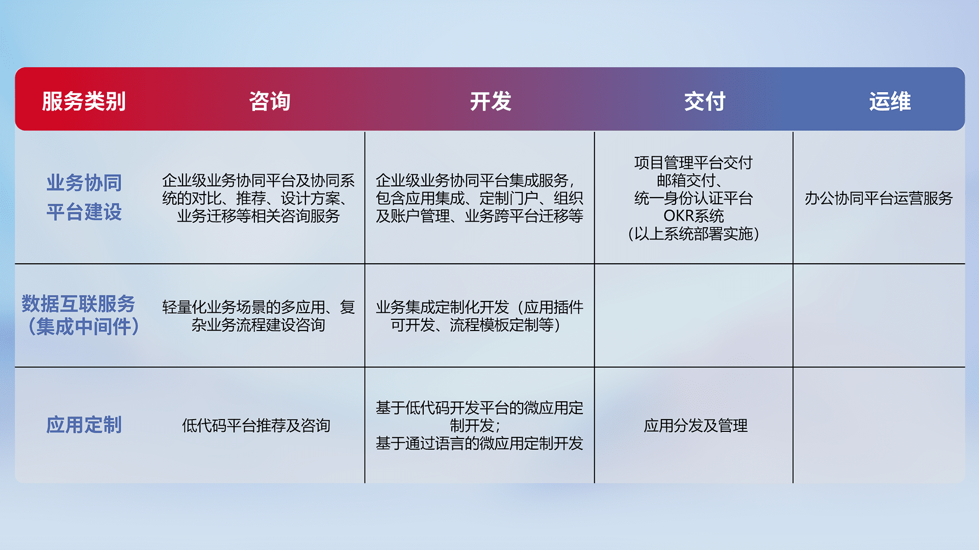 针对钉钉、、、、企微、、、IDaas等平台级产品提供产品的规划、、、方案、、、、交付、、、、定制化开发等服务,,,,实现如统一协同办公、、、智能客户服务、、、、混合会议管理、、、、智能数据查询、、、、等业务场景,,,,实现数字化转型。。。。