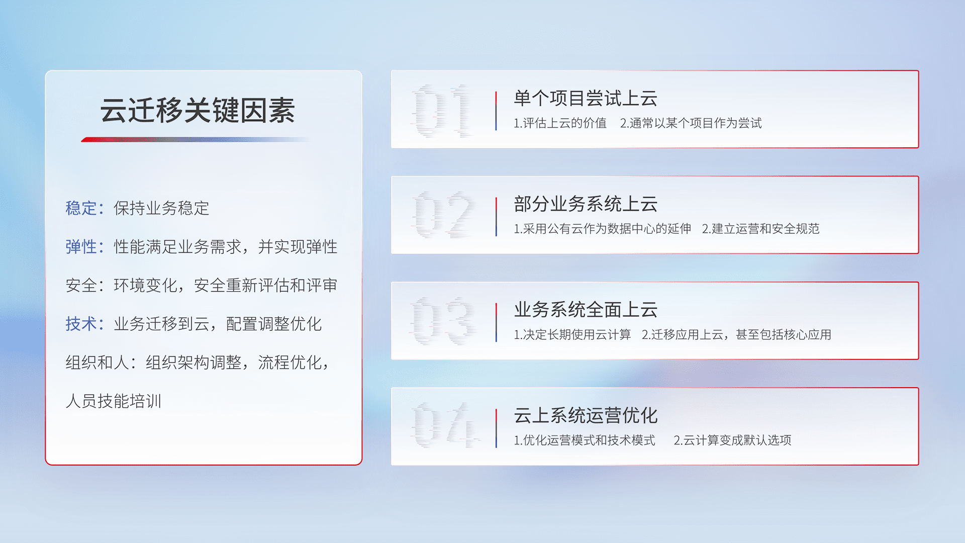 结合实际业务,,,从规划设计、、云平台选型、、云原生改造、、、、数据迁移、、、集成交付,,迁移全过程为客户识别最佳上云路径,,做好风险识别管理,,,,设计网络架构、、、身份权限、、安全审计合规、、、操作审计、、、、日志审计、、监控告警策略、、、多站点容灾设计等,,对云上基础设施进行整体规划,,,,提升IT治理水平,,,以满足弹性、、、、高可用、、高性能的需求。。。。
