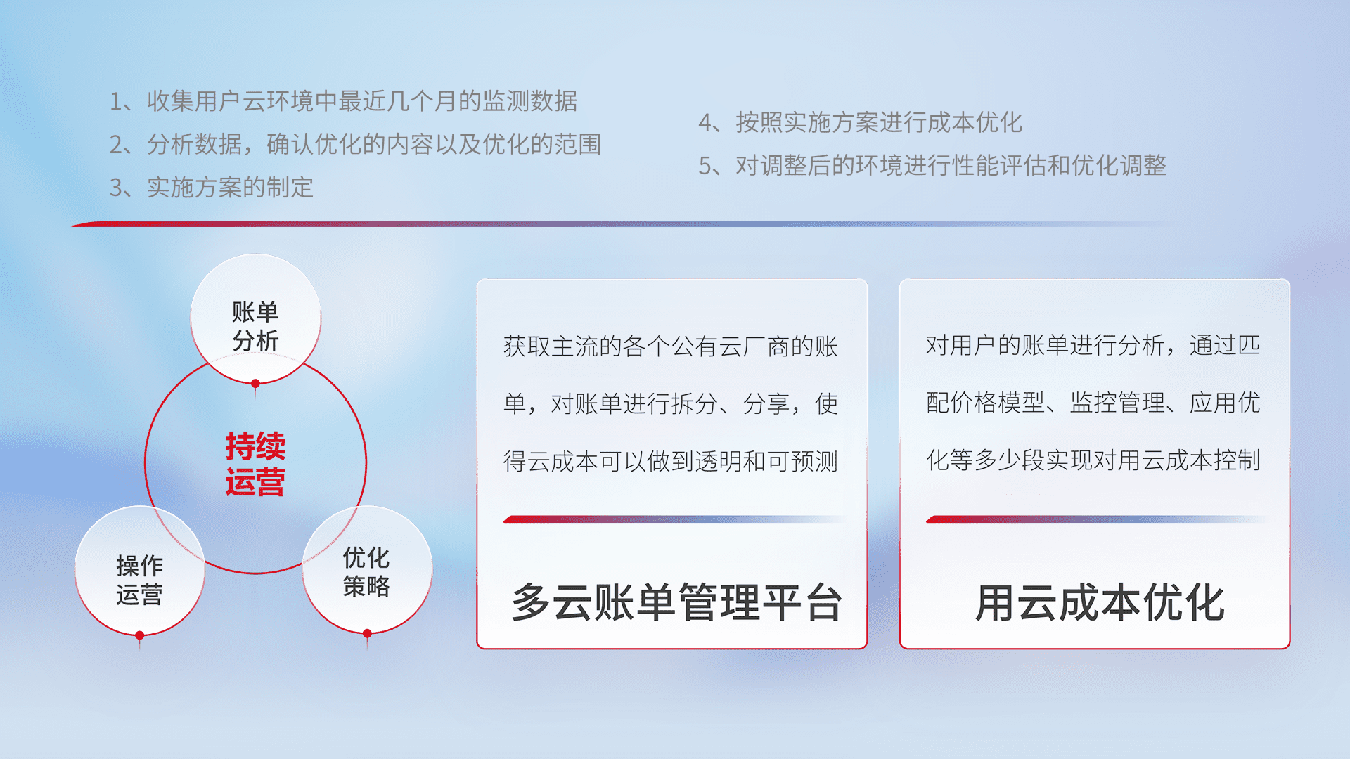 通过多云纳管,,以统一的资源数据模型把客户的云资源进行抽象和封装,,,进而实现对多云资源的统一操作,,,,保障云资源管理的可靠性、、、、稳定性与可用性。。量身定制化运维内容,,配置、、开发运维、、、、补丁管理、、、、备份、、、、监控、、、、认证和访问管理、、、、审计和日常巡检等,,,保障在用云过程中的可靠度,,稳定度以及高可用率。。。